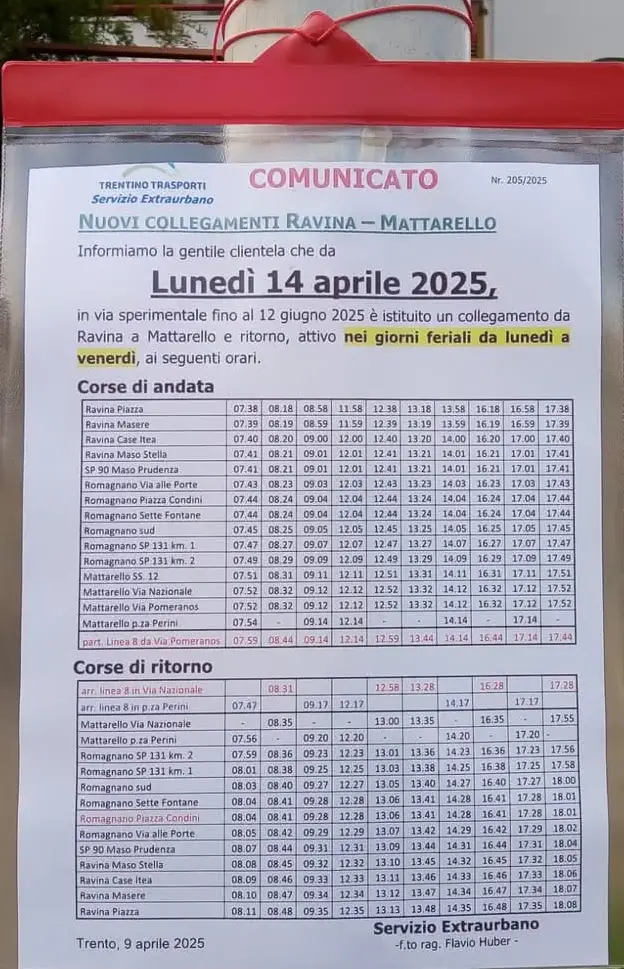 Orgogliosi di questo grande risultato raggiunto da Union Trento per le nostre comunità, esortiamo la popolazione di Mattarello e di Ravina ad utilizzare il trasporto proposto con continuità, in modo da poter dimostrare la sua grande utilità e ottenere a giugno la conferma definitiva del servizio.